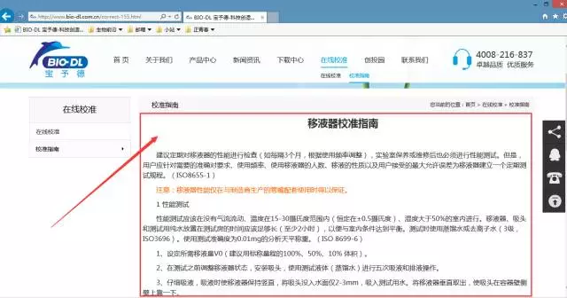 2.點擊下圖紅色箭頭指示的“在線校準(zhǔn)”進(jìn)入移液器在線校準(zhǔn)服務(wù)。