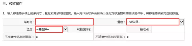 5.以下界面填入移液器手柄上的序列號,選擇量程和測試時的溫度。輸入完畢后軟件會自動出現(xiàn)此支移液器所需測試的體積,將移液器調(diào)到對應(yīng)的體積數(shù)值。