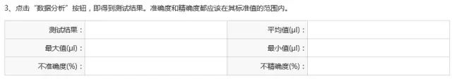 6.根據(jù)移液器校準(zhǔn)指南操作,讀取天平讀數(shù),輸入下示表格,并點擊藍(lán)色按鈕“數(shù)據(jù)分析”。