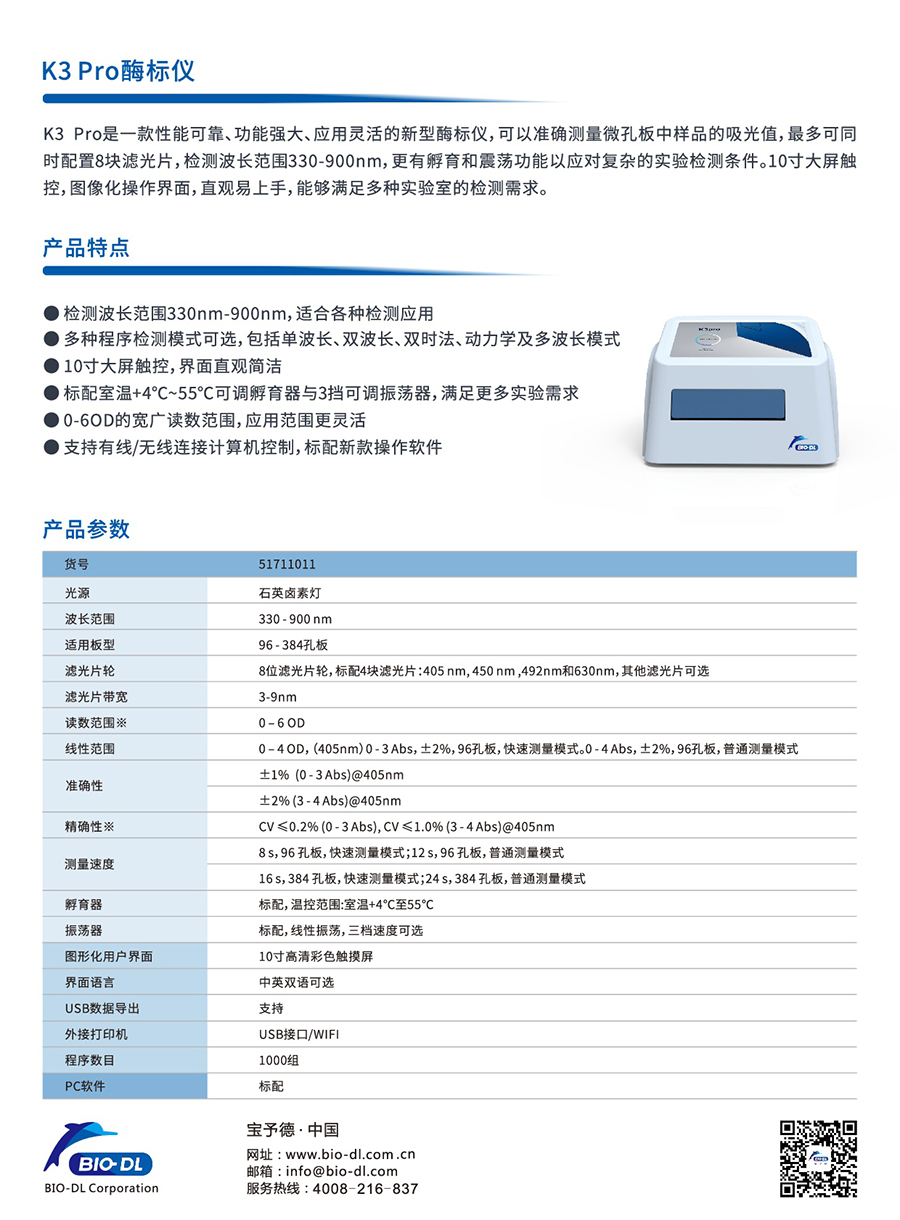 K3 Pro是一款性能可靠、功能強大、應用靈活的新型酶標儀,可以準確測量微孔板中樣品的吸光值,最多可同時配置8塊濾光片,檢測波長范圍340-850nm,更有孵育和震蕩功能以應對復雜的實驗檢測條件。10寸大屏觸控,圖像化操作界面,直觀易上手,能夠滿足多種實驗室的檢測需求。