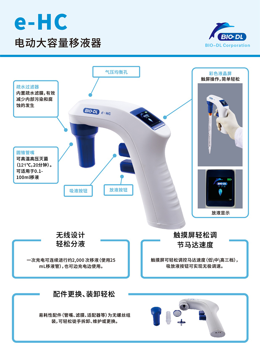 BIO-DL e-HC電動(dòng)大容量移液器,大容量移液器,電動(dòng)移液器,具備出色的人體工程學(xué)設(shè)計(jì),靈敏的速度控制功能可確保對(duì)多種液體進(jìn)行輕松順暢移液與分液。